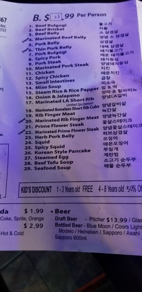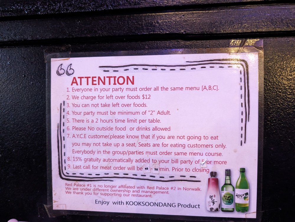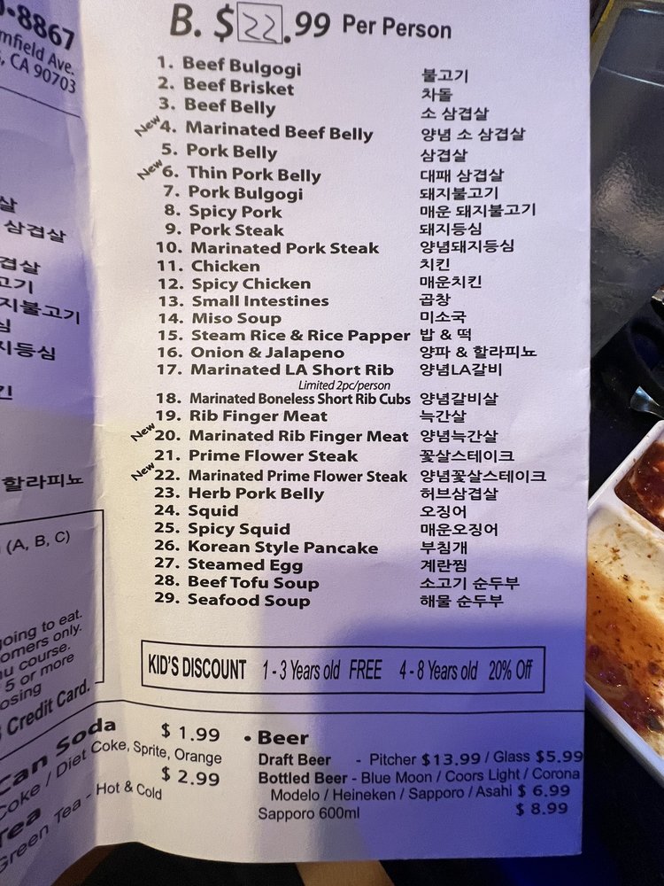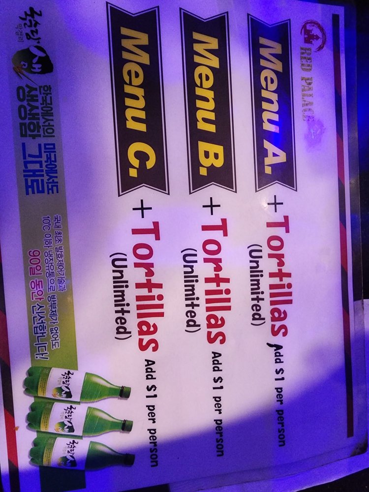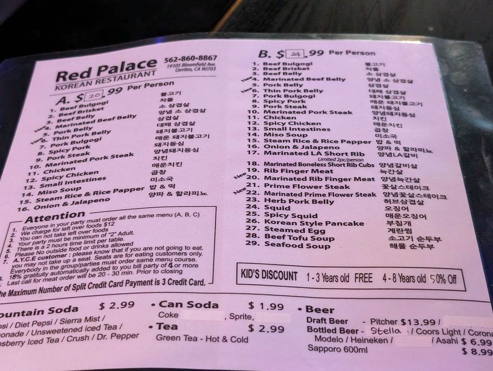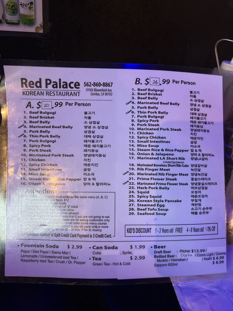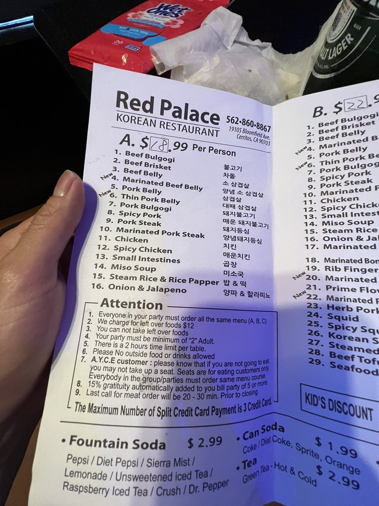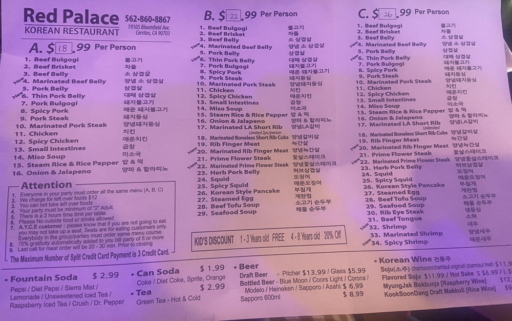 Introducing the menu at Red Palace, a Korean BBQ restaurant located in Cerritos, CA. Offering a variety of meats and vegetarian options, this casual spot is perfect for groups and families. The menu features traditional dishes like Bulgogi and complimentary macaroni salad, praised by customers for their taste and quality. While service may vary, the ambiance with low lighting creates a cozy and family-friendly atmosphere. With options for delivery, takeout, and catering, Red Palace is a convenient choice for any occasion. Don't miss out on the Happy Hour specials and the chance to enjoy outdoor seating. Overall, Red Palace provides a delicious dining experience with a diverse menu and welcoming environment.